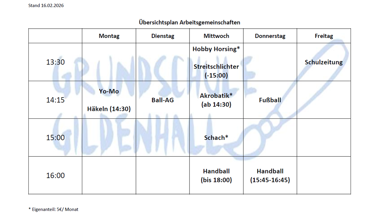 Auch über den Schultag hinaus unterstützen wir unsere Schülerinnen und Schüler beim Lernen. Unser AG-Angebot richtet sich dabei an die Interessen der Schülerinnen und Schüler und wird in Kooperation mit dem Hort am See, sowie externen Partnern umgesetzt.